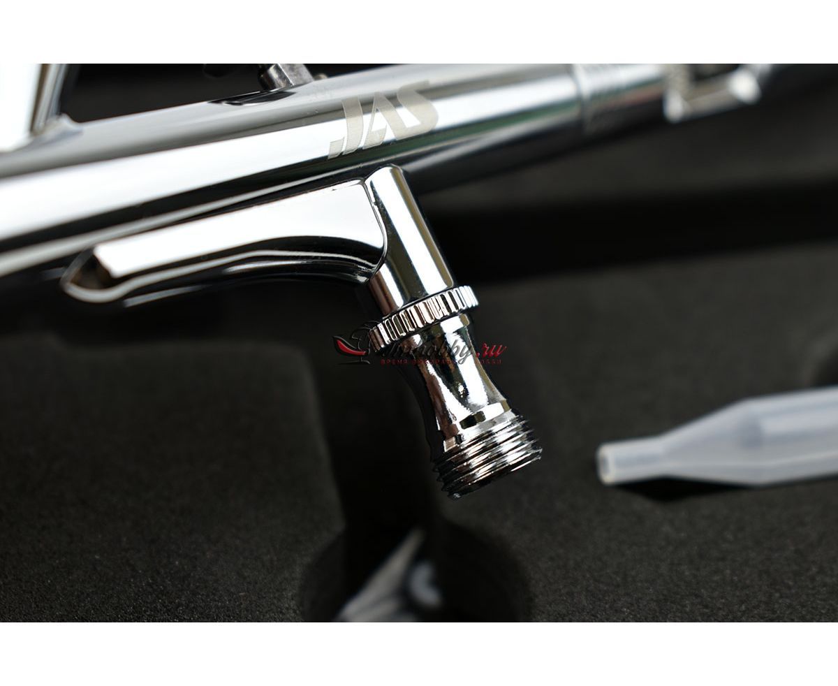 Универсальный аэрограф JAS1186 с корончатым соплом 0,2 мм, бачком 2 мл, и верхней подачей краски. Хороший аэрограф для мелких работ, росписи мелких объектов, работы с ногтями, позволяет получать тонкие линии от 0.5 мм шириной.