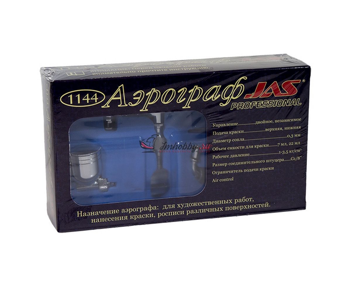 Универсальный аэрограф JAS1144 с резьбовым соплом 0,3 мм, бачками 7 и 22 мл, и боковой подачей краски. Функция Air Control для тонкой настройки соотношения воздуха и краски.