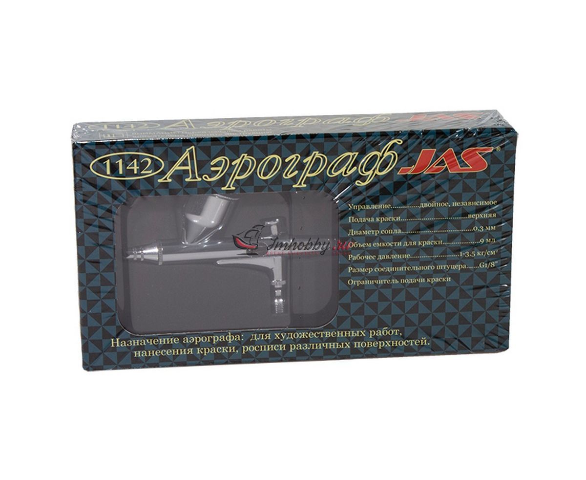 Универсальный аэрограф JAS1142 с резьбовым соплом 0,3 мм, бачком 9 мл и верхней подачей краски.