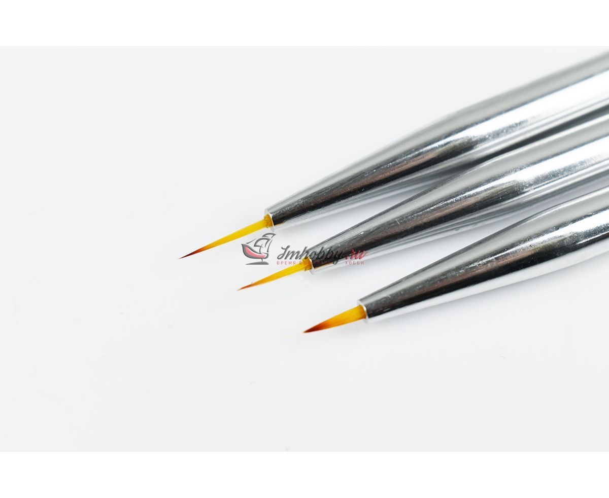 Набор из трёх очень тонких кисточек с деревянной ручкой под мрамор. Кисточки ровные, удобно лежат в руке. Подходят для работ с акриловыми красками. Удобны для раскрашивания мелких деталей и росписи миниатюры.