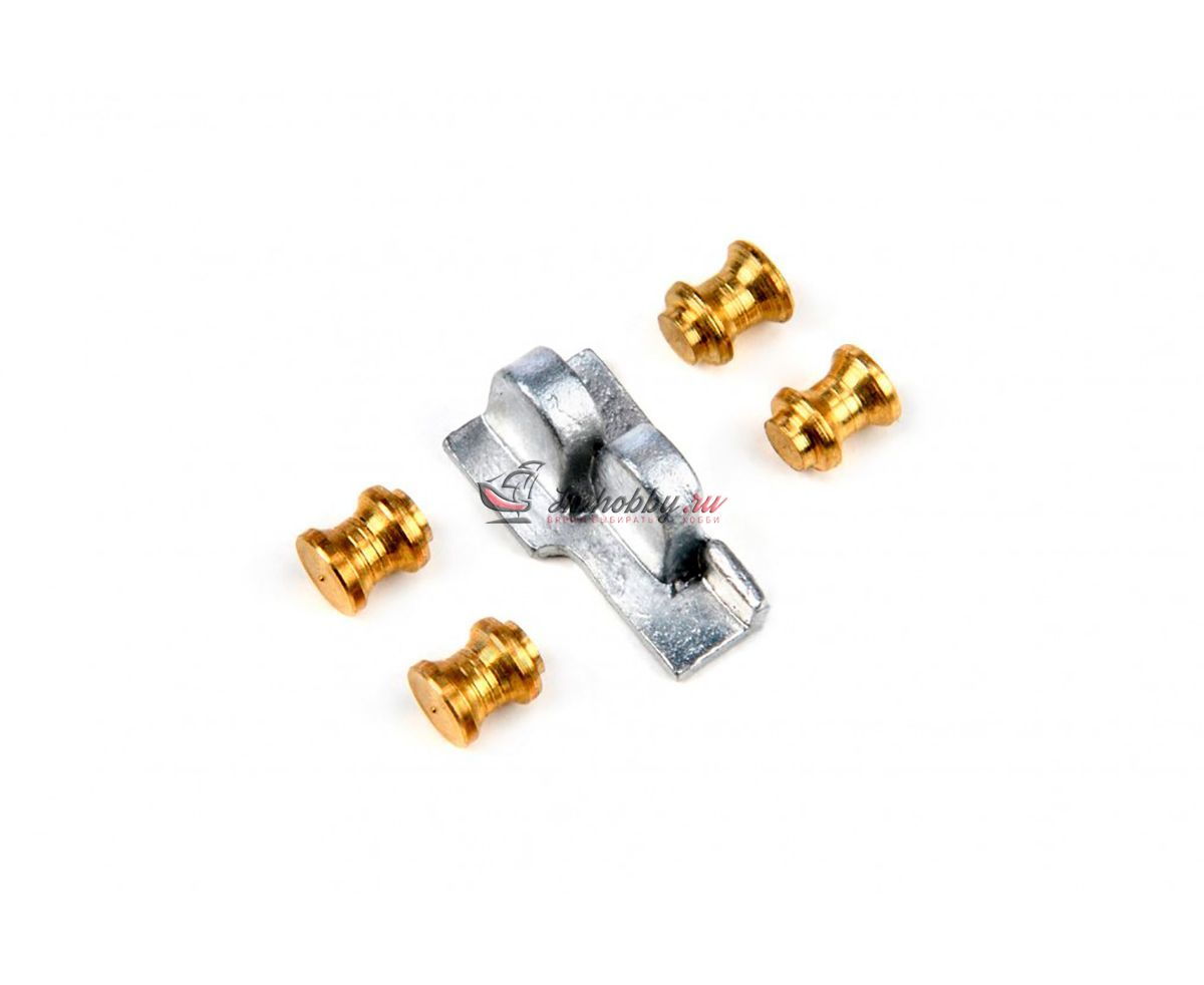 Двойная лебедка с четырьмя барабанами. Применяется как часть палубных механизмов современных пассажирских лайнеров. Масштаб примерно 1:250. В частности, подобные лебедки были на Титанике. Латунь и белый металл. Размер в проекции сверху 10х11 мм, высота над основанием 5 мм. Длина каждого бокового барабана 4 мм.