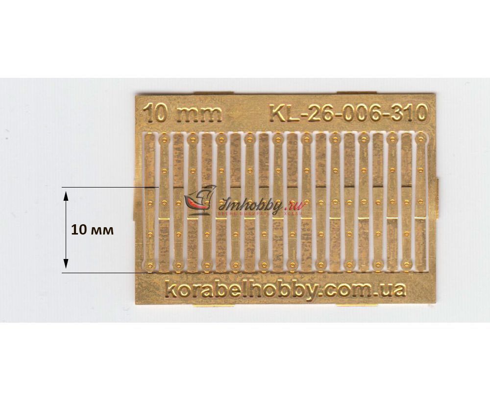 Фототравленая латунная пластина UKR26-006-310, на которой размещены двадцать 10 мм петель (круг) пушечных портов с имитацией гвоздей.