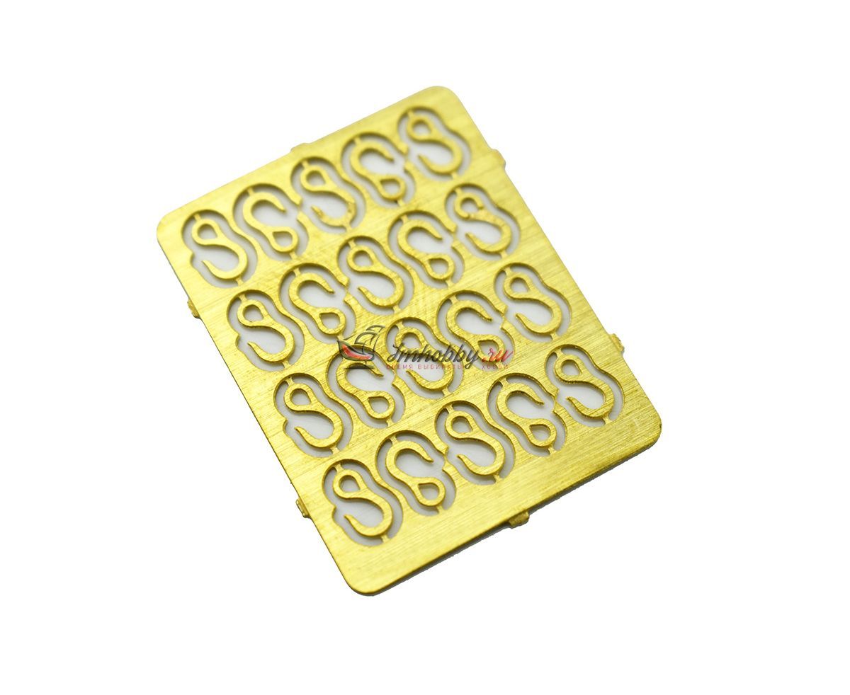 Набор из 20 повернутых гаков высотой 3 мм. В отличие от обычных гаков, отверстие для троса выполнено в форме капельки. Гаки изготовлены из латуни методом фототравления. Для подъема грузов или буксировки гаки прикрепляются к концу каната, троса или цепи.