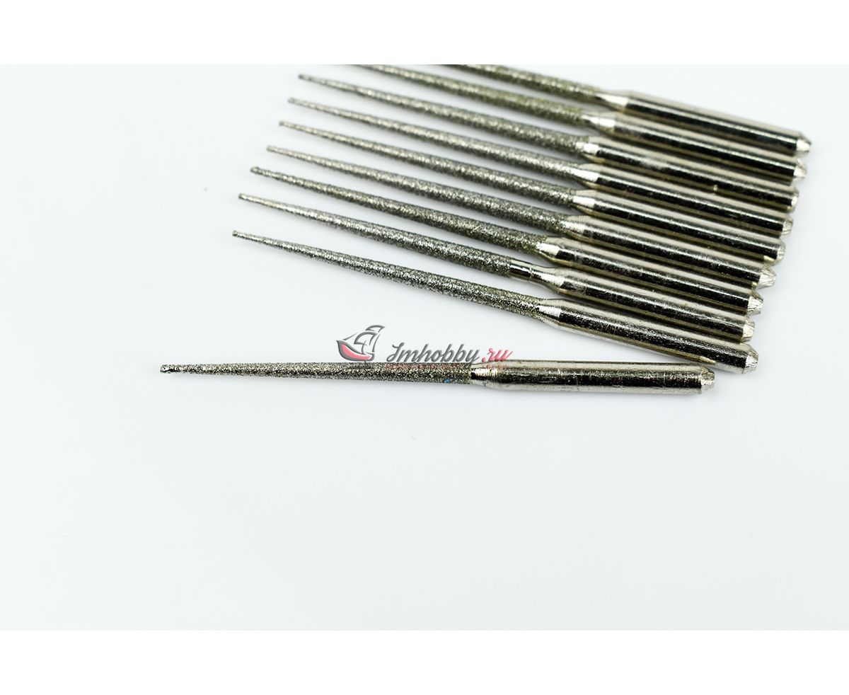 Комплект игольчатых алмазных боров длиной 50 мм. Хвостовик диаметром 3 мм и длиной около 20 мм. Рабочая часть в длину примерно 30 мм, к концу сужается. В самой широкой части (у хвостовика) диаметр примерно равен 2 мм. В комплекте 10 одинаковых боров.