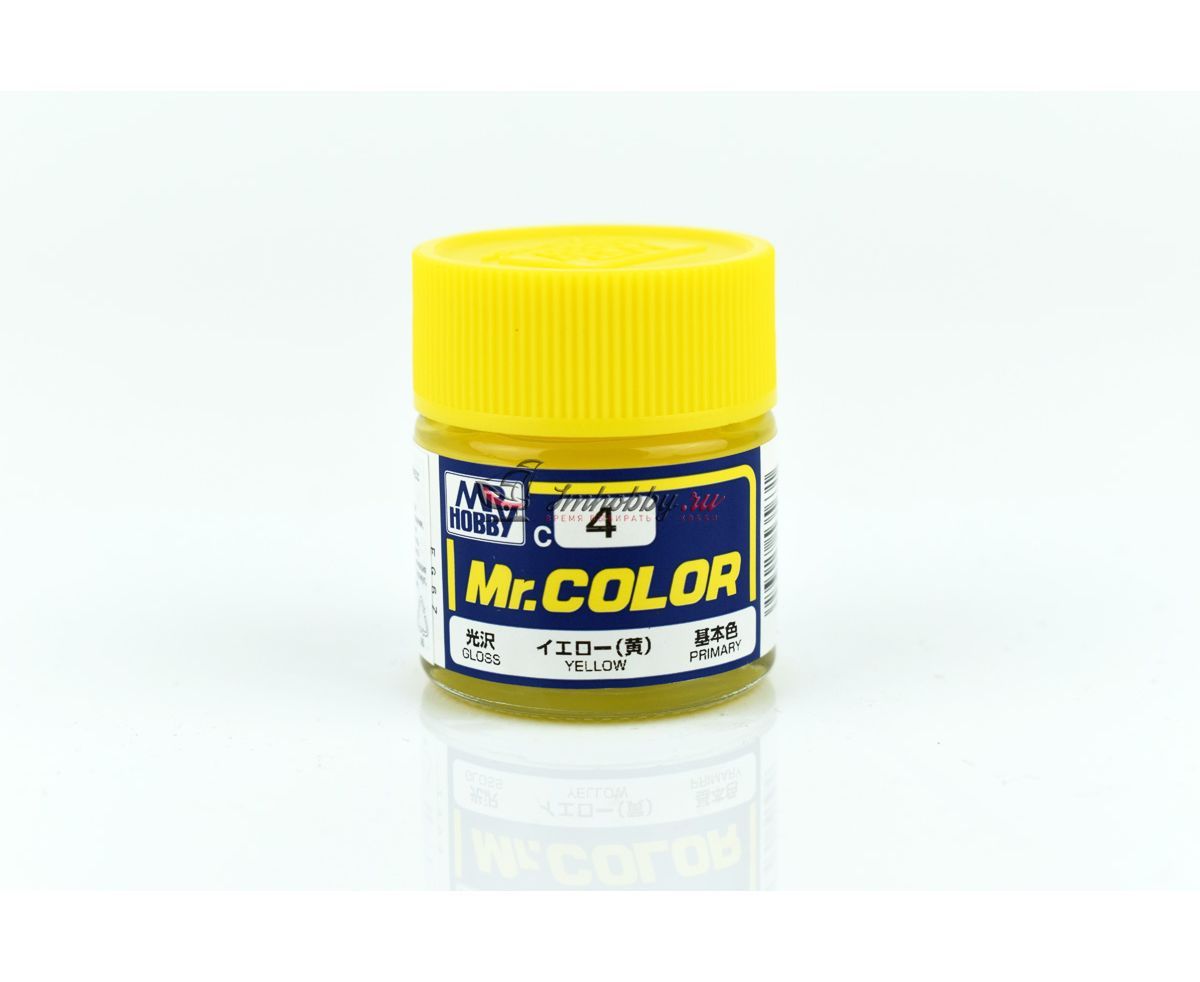 Глянцевая эмалевая (нитро-акриловая) краска от японского производителя Mr.Hobby (Gunze Sangyo), C-серии Mr.Color. Цвет базовый желтый (Primary Yellow), поставляется в круглой стеклянной баночке 10мл.