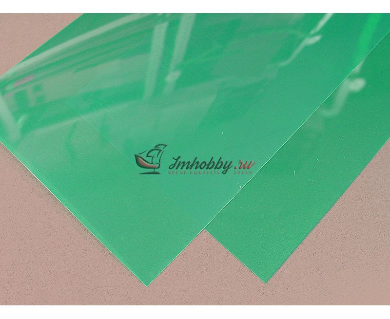 Листы 15х30 см из полупрозрачного зеленого пластика (полистирол). Хорошо обрабатывается и клеится полистирольным клеем. Производитель Evergreen, США. Толщина 0,25 мм. В упаковке 2 листа.