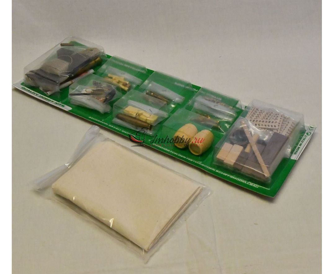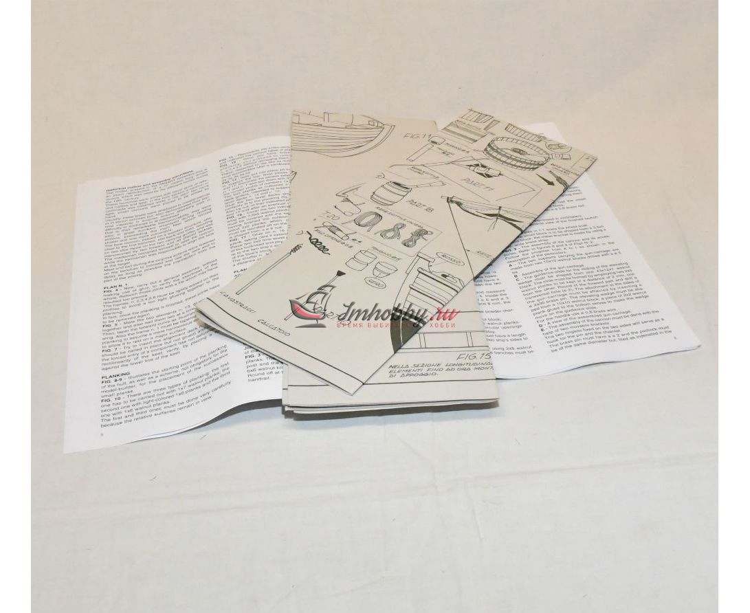 Показаны все элементы шлюпки и ее вооружения: банки и шпангоуты, утки и уключины, ядра и картузы с зарядами, протравник и шомпол, пыжи и банник, ведра и канаты, якорь и фонарь. Особого внимания заслуживает вооружение шлюпки: 10 см пушка на станке со всеми необходимыми атрибутами сама по себе уже заслуживает восхищения. Какая большая модель может похвастаться пушками длиной 55 мм? А здесь это лишь легкая добавка в корме к основной пушке. Шлюпка имела два движителя - десять пар весел и парус. В модели предстоит изготовить то же самое, причем выбирать, сколько весел спустить на воду, а сколько оставить в сложенном положении, ставить или убрать парус - решать вам. Четыре больших полноразмерных листа чертежей и книга с инструкциями позволяют собрать эту отличную и очень подробную модель без особых проблем.