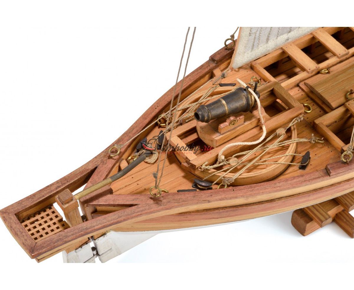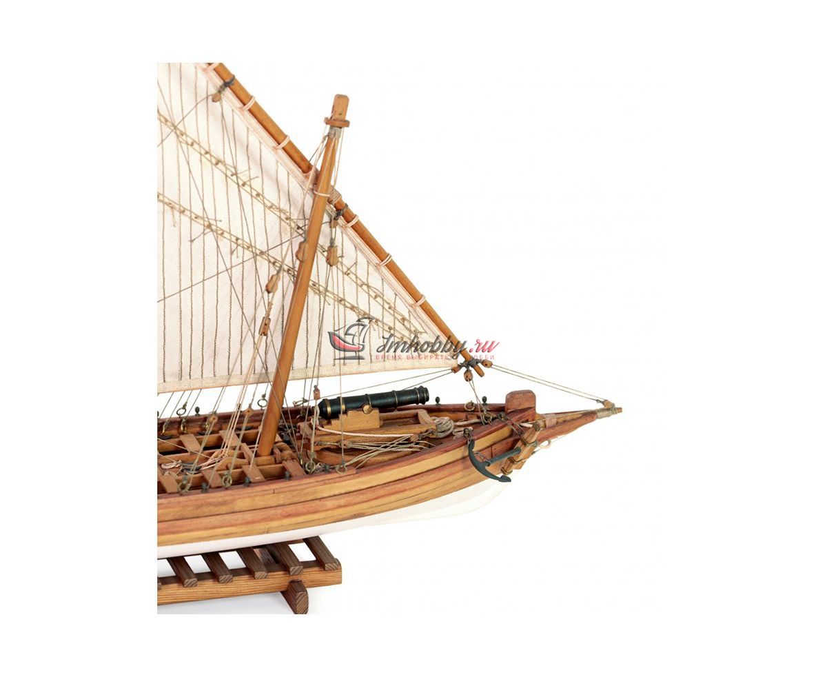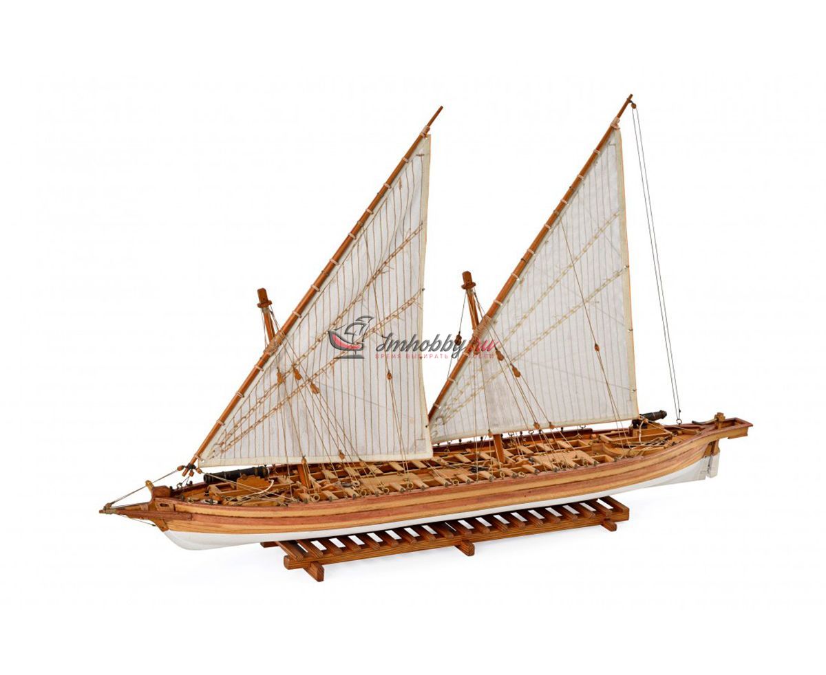 Интересная наборная конструкция корпуса модели обшивается как изнутри (настил), так и снаружи. Изнутри используются рейки танганики шириной 3мм, первая внешняя обшивка корпуса выполняется рейками липы 1х3мм, вторая рейками ореха 0,5х3мм. Специфичные для канонерки обводы корпуса завершаются интересной конструкцией штевней. В носовой и кормовой частях лодки на поворотных площадках устанавливаются пушка и карронада – страшная, разрушительная сила. Фок и грот-мачта модели сильно наклонены вперед, две реи несут латинские паруса. По этой причине такелаж будет выполнять интересно и не очень сложно. При этом используются нити трех диаметров от 0,25 до 0,75мм. Два паруса пропечатанны на ткани, но можно их сделать и самостоятельно. Подставка в виде стапеля входит в комплект. Хорошие чертежи на 4-х больших страницах и инструкция на 16-ти страницах великолепно соответствуют высокому уровню детализации модели. Кроме того, к комплекту прилагается перевод инструкции на русский язык с комментариями, советами и предостережениями.