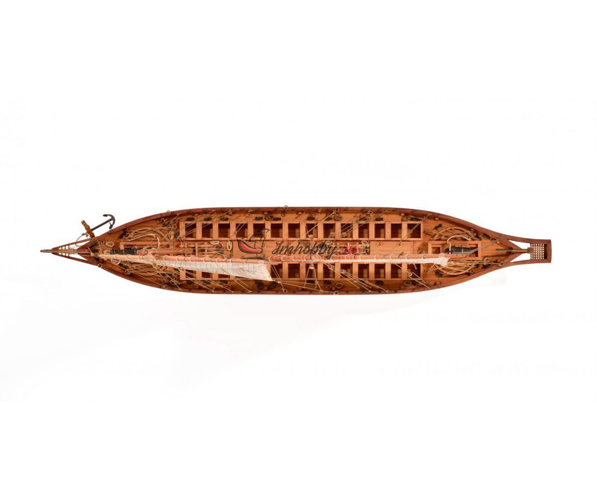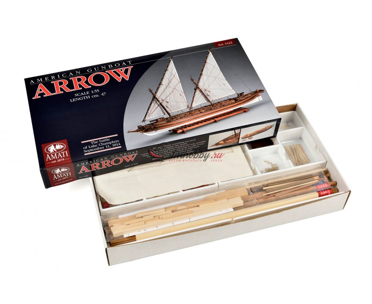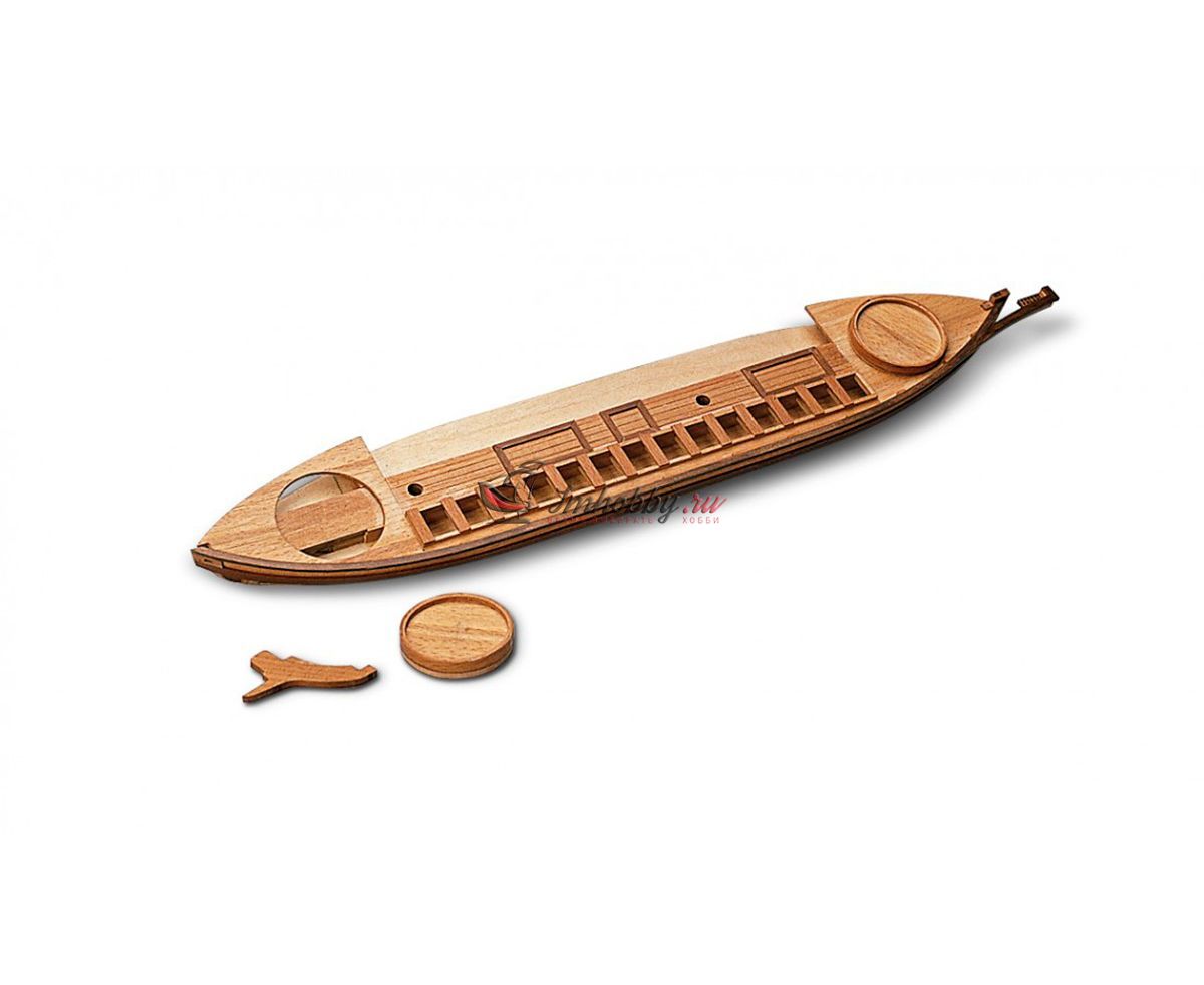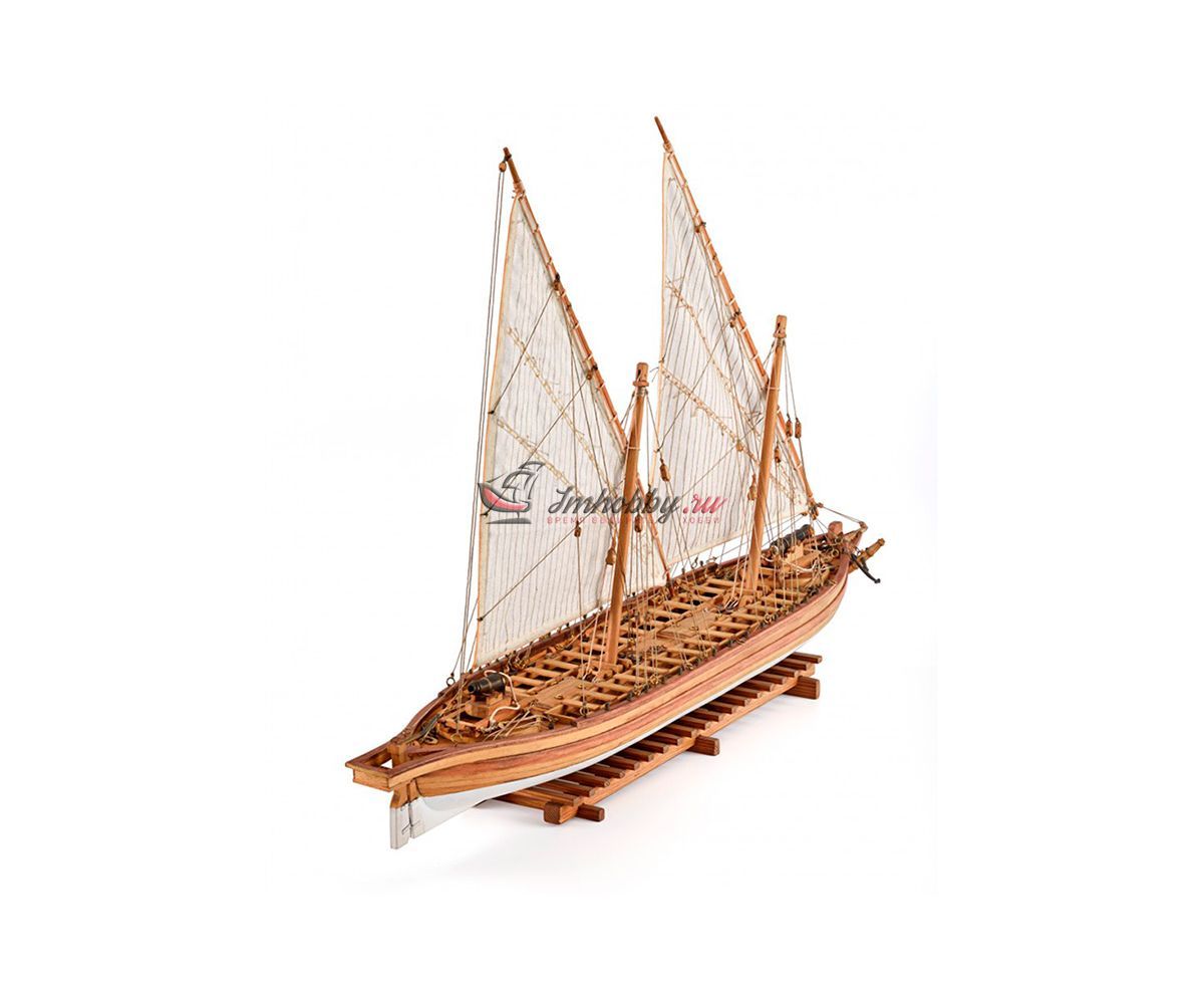 Интересная наборная конструкция корпуса модели обшивается как изнутри (настил), так и снаружи. Изнутри используются рейки танганики шириной 3мм, первая внешняя обшивка корпуса выполняется рейками липы 1х3мм, вторая рейками ореха 0,5х3мм. Специфичные для канонерки обводы корпуса завершаются интересной конструкцией штевней. В носовой и кормовой частях лодки на поворотных площадках устанавливаются пушка и карронада – страшная, разрушительная сила. Фок и грот-мачта модели сильно наклонены вперед, две реи несут латинские паруса. По этой причине такелаж будет выполнять интересно и не очень сложно. При этом используются нити трех диаметров от 0,25 до 0,75мм. Два паруса пропечатанны на ткани, но можно их сделать и самостоятельно. Подставка в виде стапеля входит в комплект. Хорошие чертежи на 4-х больших страницах и инструкция на 16-ти страницах великолепно соответствуют высокому уровню детализации модели. Кроме того, к комплекту прилагается перевод инструкции на русский язык с комментариями, советами и предостережениями.