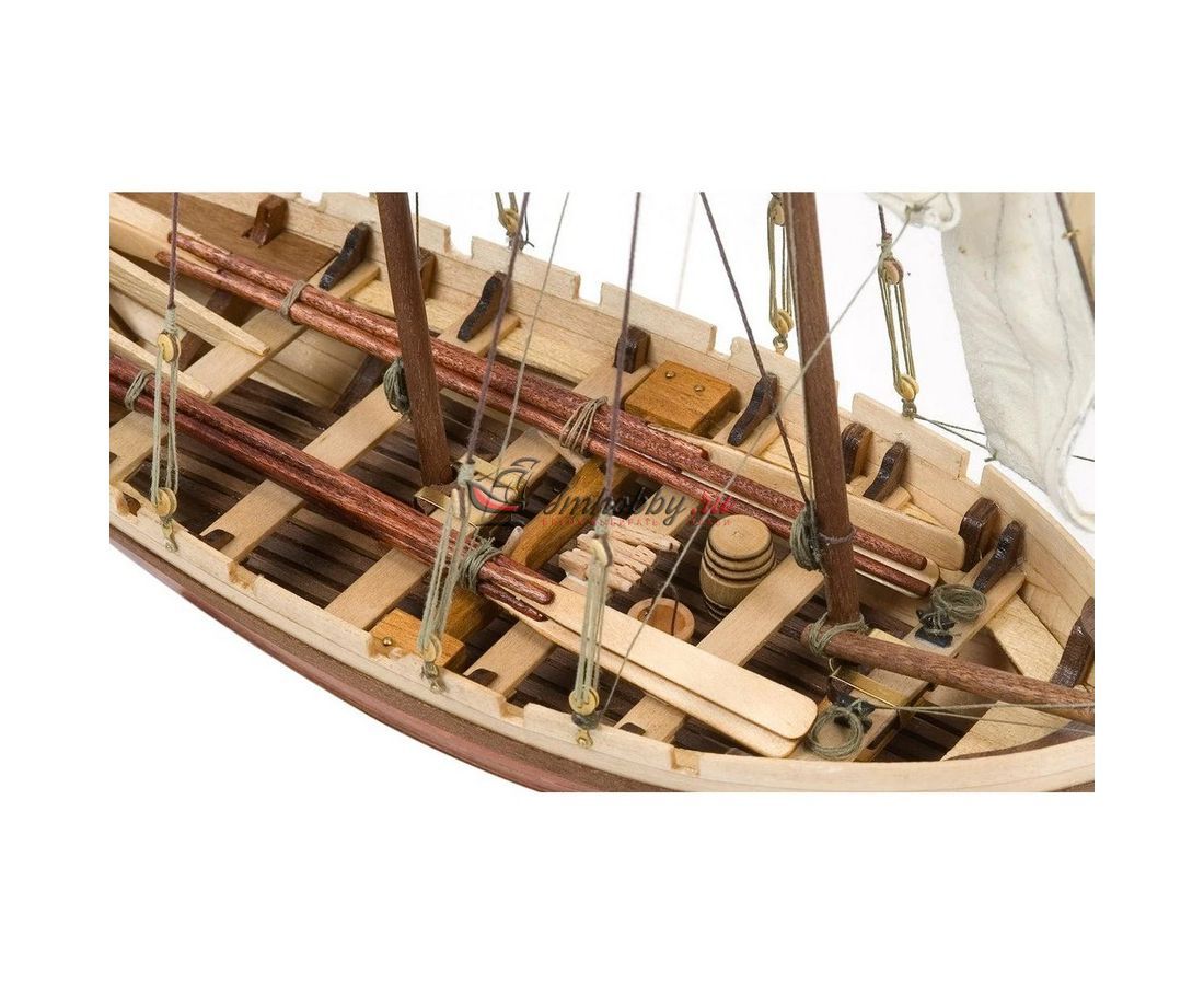Полноценный каркас собирается из уже вырезанных лазером киля и шпангоутов, отдельными рейками выполняется настил, устанавливаются банки, выполняется малковка и затем обшивка бортов с креплением реек на клей и миниатюрные гвоздики. Обшивка двухслойная: внутри из крепких реек липы, а снаружи из тонких реек ореха. Шлифовка, полировка, покрытие лаком корпуса – и вот вы готовы устанавливать перо руля, кницы, барабан брашпиля, направляющие под якорный канат, рангоут (две мачты, бушприт и две реи), готовы натягивать такелаж из прилагаемых темных и светлых нитей, устанавливать готовые паруса из ткани. Модель дополнена переводом инструкции на русский язык.