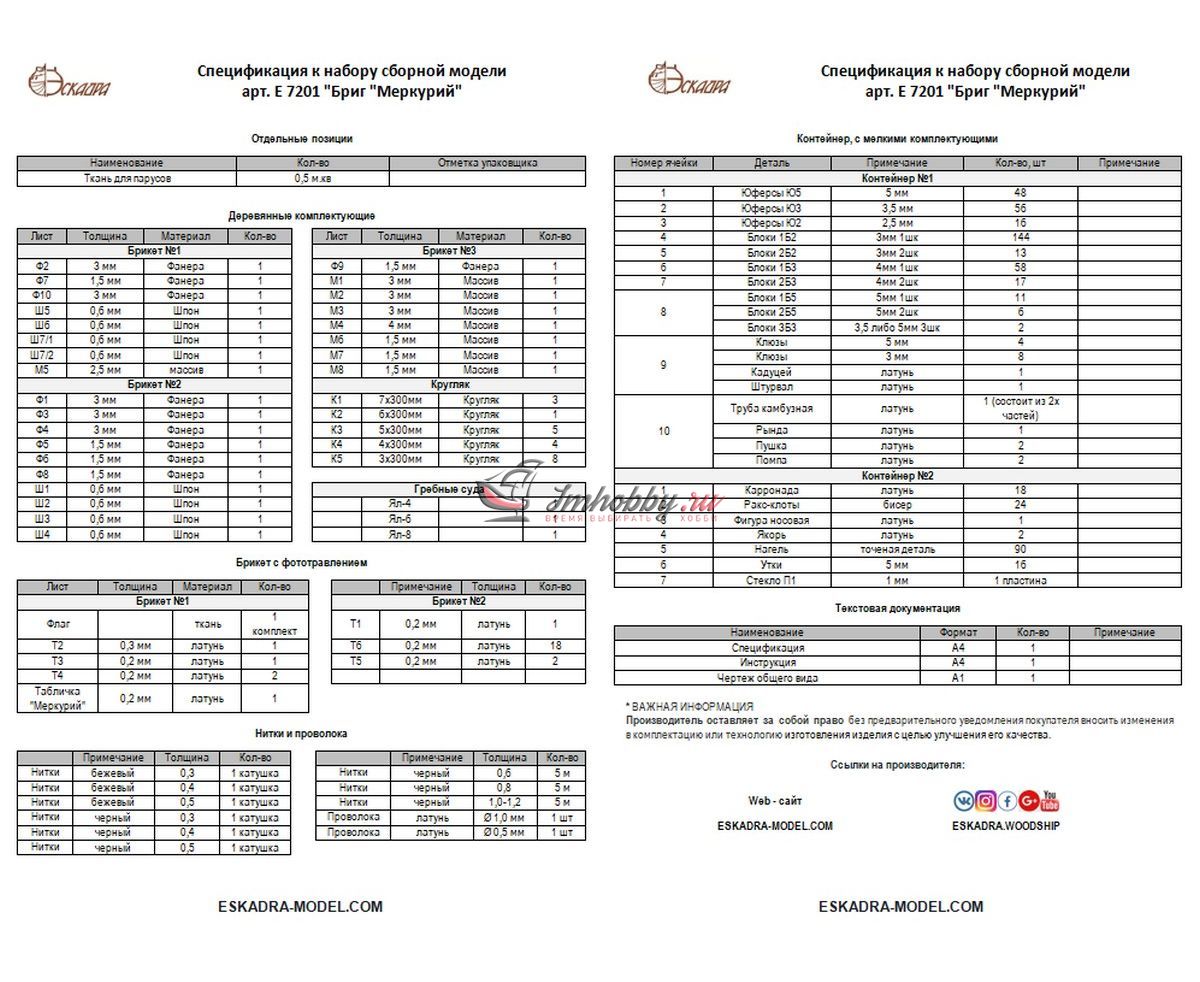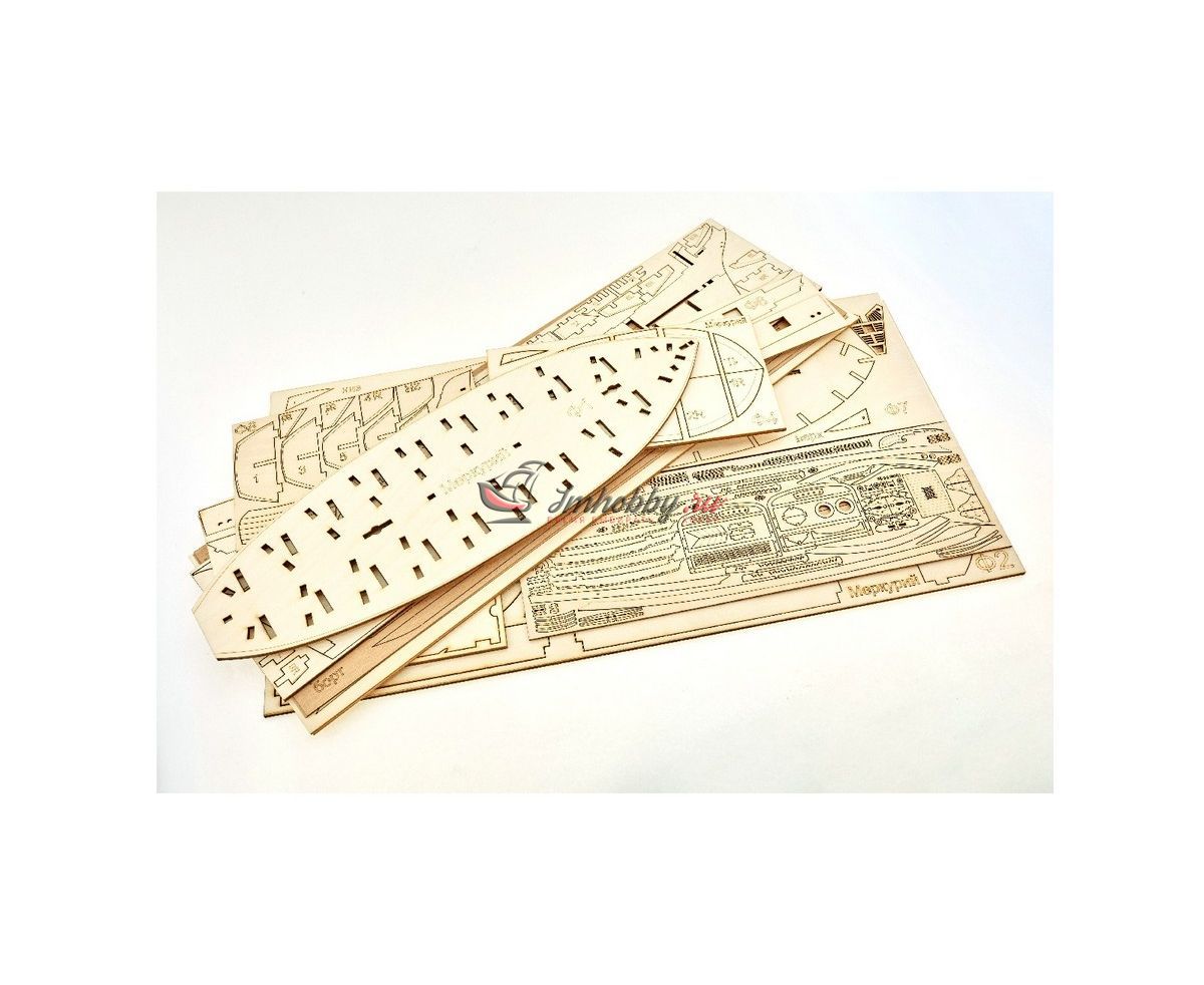 Фанера, шпон (анегри, груша, липа, граб), древесный массив-ламель (груша, ясень), латунное литьё (пушки-карронады, носовая фигура бога Меркурия, штурвал, судовой колокол, якоря и пр.), точёные латунные нагели, точёные деревянные элементы (юферсы, блоки), заготовки мачт (берёза), ткань для парусов (перкаль).