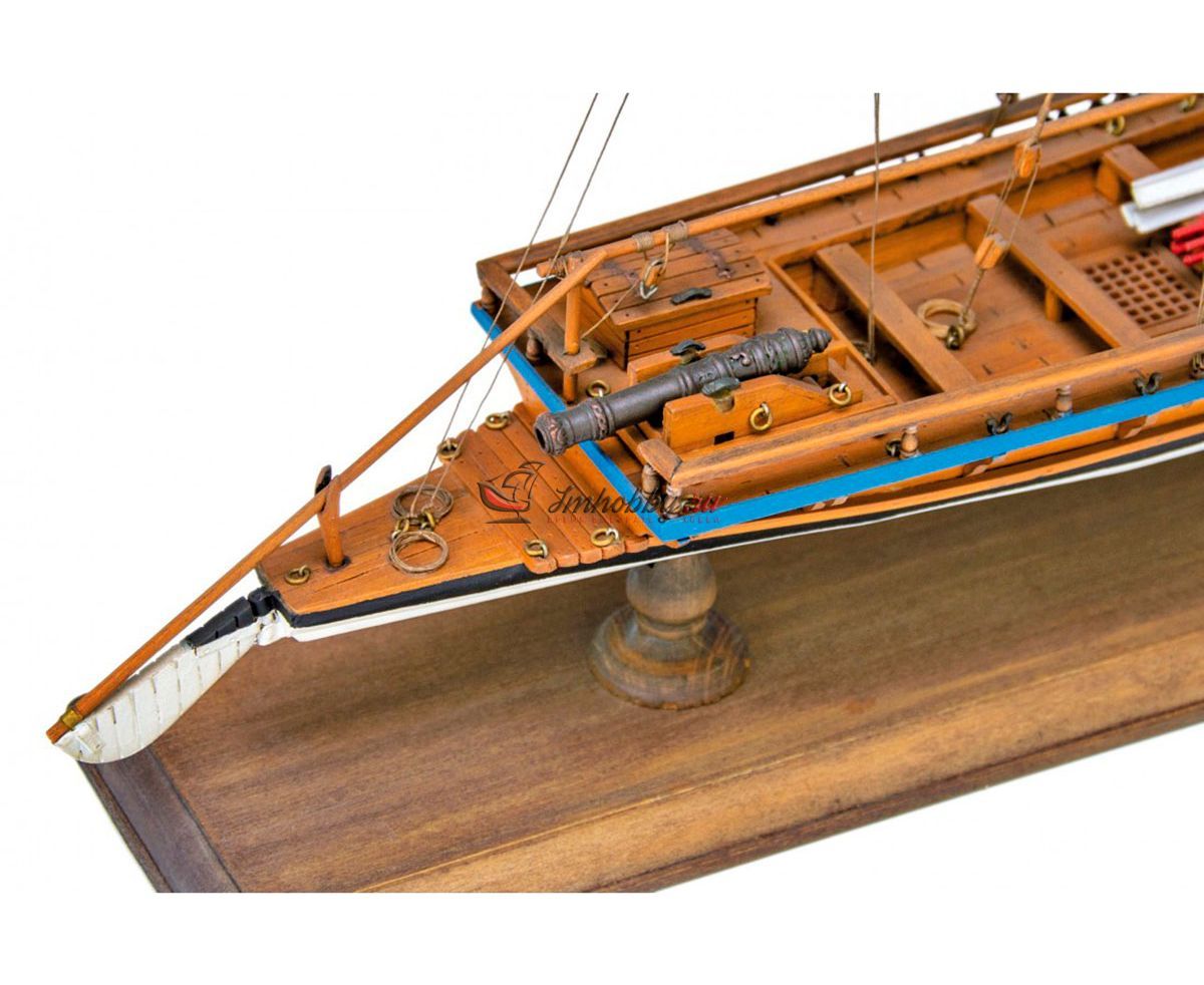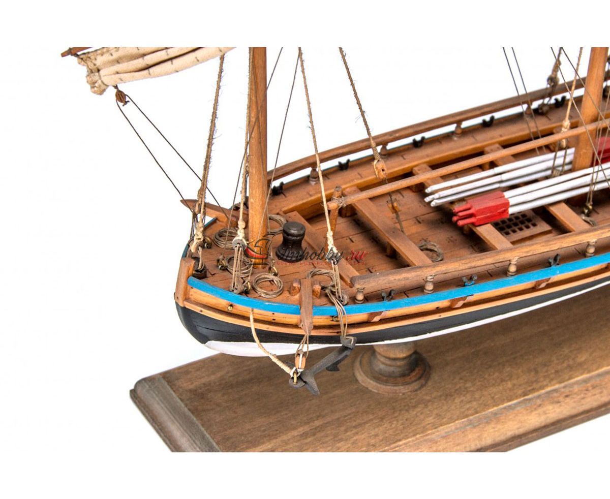 Корпус модели собирается из вырезанных лазером деталей и имеет одинарную обшивку из бука. В комплект входят металлические якоря, рымы, гвоздики, петли руля, 45 мм пушка, уключины для вёсел. Из дерева (орех, самшит, липа) даны блоки, юферсы, решётки, весла, шпиль и пиллерсы. Обшивку и детали рангоута предлагается выполнить из таких пород дерева как липа, бук и тёмный орех. Завершают модель нити для такелажа, паруса, которые предстоит выполнить самостоятельно из прилагаемой ткани . Набор содержит полномасштабный чертеж и лаконичную инструкцию по сборке (поэтому мы рекомендуем эту модель для тех, кто уже имеет опыт изготовления деревянных моделей кораблей). Подставка для модели собирается по схемам из отдельных деталей.