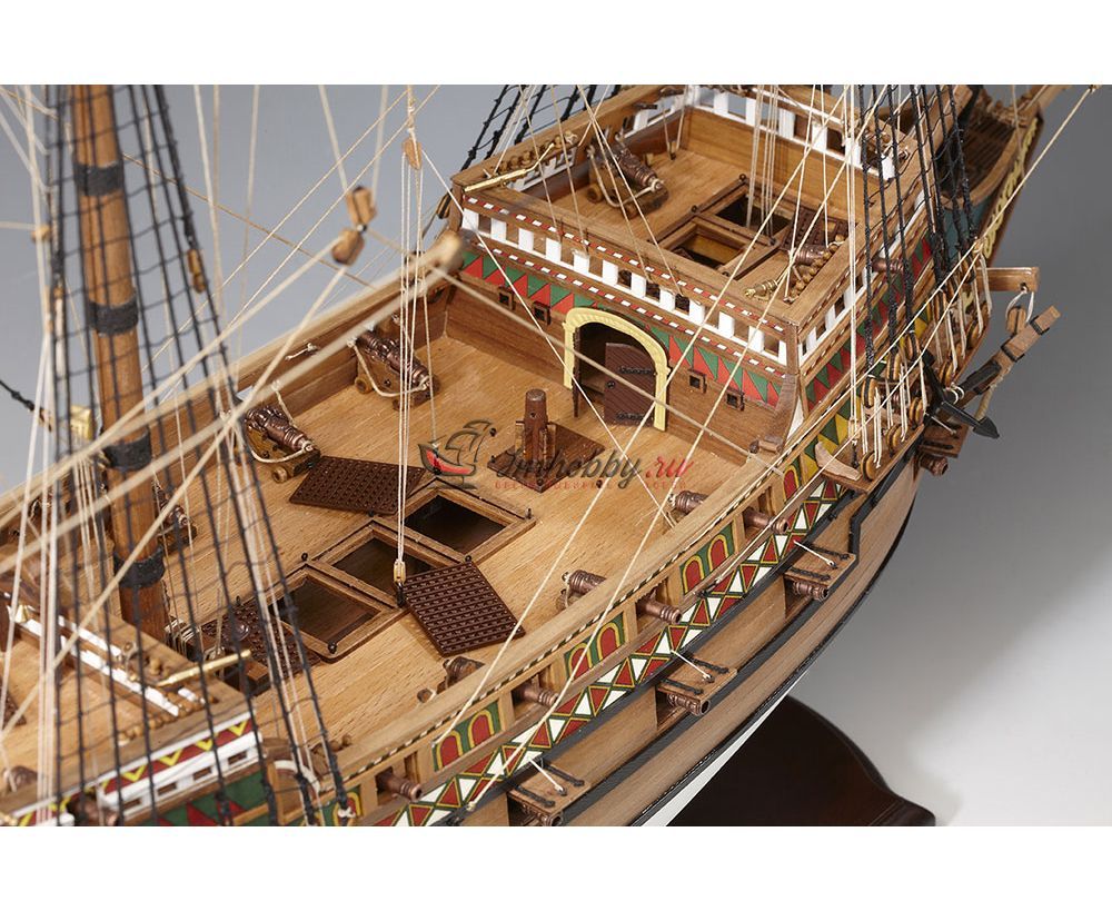 Не обошлось у Revenge и без новинок. Бросаются в глаза фототравленные решетки. Хотя они выполнены великолепно, всё же хотелось бы их видеть в дереве, а не в металле. Большое внимание на модели галеона уделено нижней палубе. На ней выполнены люки, трапы в трюм, шпиль и даже действующий кальдершток! Стоит ли говорить, что у Revenge нет ни одной полупушки, все пушки полноценные и устанавливаются на деревянных лафетах. Как повелось на других моделях серии Victory Models, верхние части бортов стыкуются на «ласточкин хвост» из отдельных деталей тонкой фанеры. Наверное, это себя хорошо зарекомендовало, и нет проблем с расположением и прорезанием пушечных портов.
