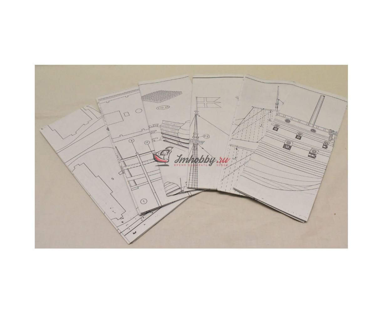 В наборе не дана ткань для парусов, но даны их выкройки и схемы проводки снастей на тот случай, если вы захотите поставить на модель паруса. Инструкция и чертежи на 12 больших страницах и дадут опытному моделисту достаточную информацию для постройки этого шедевра.