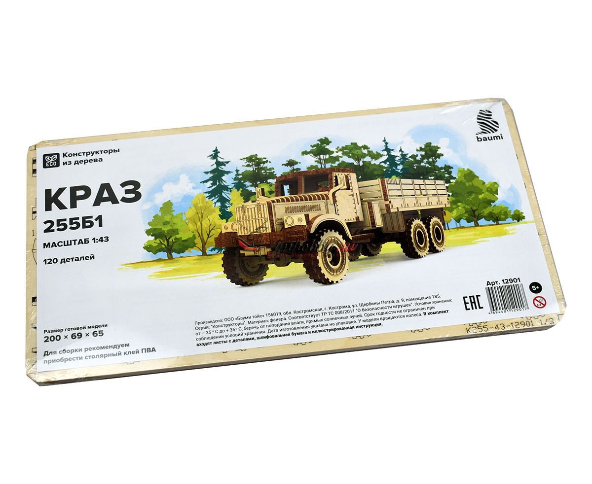 Сборная масштабная модель КРАЗ-255Б1 из фанеры. Детали изготовлены методом лазерной резки. Для сборки понадобятся столярный клей ПВА, модельный нож, надфиль (или наждачная бумага/губка). При желании модель можно окрасить или покрыть морилкой/лаком.