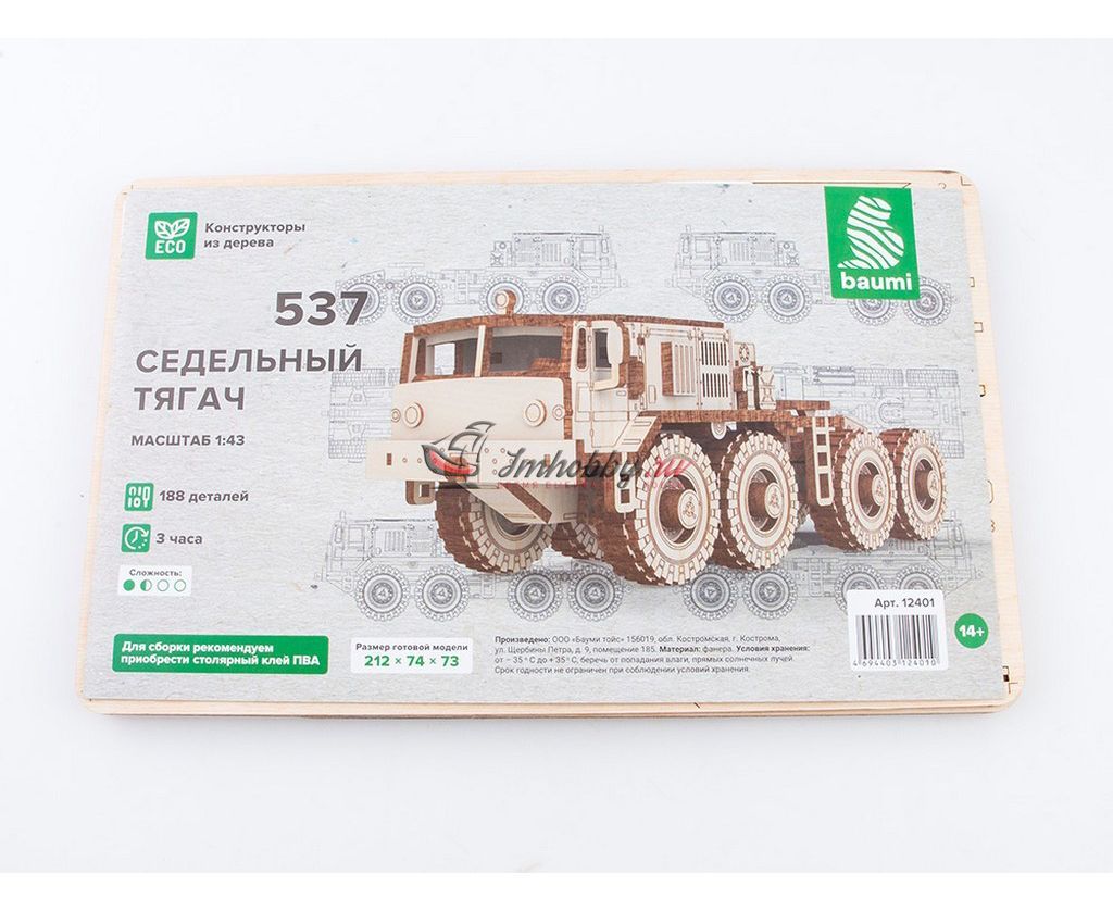 Сборная масштабная модель большегрузного седельного тягача 537 из фанеры. Детали изготовлены методом лазерной резки. Для сборки понадобятся столярный клей ПВА, модельный нож, надфиль (или наждачная бумага/губка). При желании модель можно окрасить или покрыть морилкой/лаком.