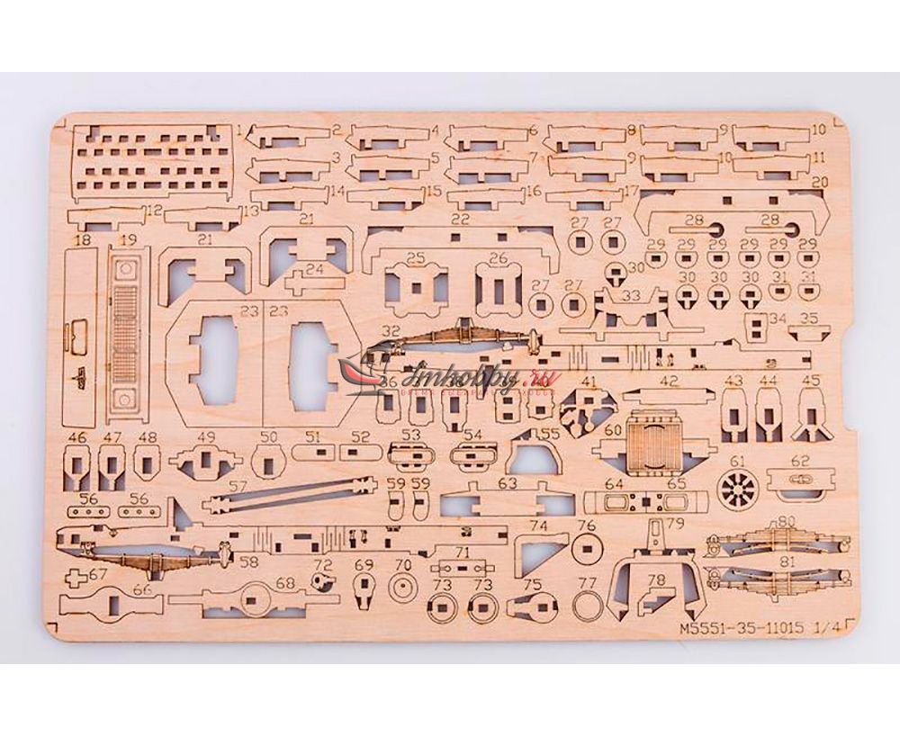 Сборная масштабная модель самосвала 5551 (ранний) из фанеры. Детали изготовлены методом лазерной резки. Для сборки понадобятся столярный клей ПВА, модельный нож, надфиль (или наждачная бумага/губка). При желании модель можно окрасить или покрыть морилкой/лаком.