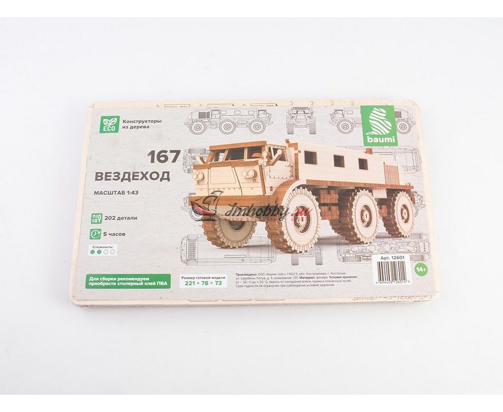 Сборная масштабная модель вездехода 167 из фанеры. Детали изготовлены методом лазерной резки. Для сборки понадобятся столярный клей ПВА, модельный нож, надфиль (или наждачная бумага/губка). При желании модель можно окрасить или покрыть морилкой/лаком.