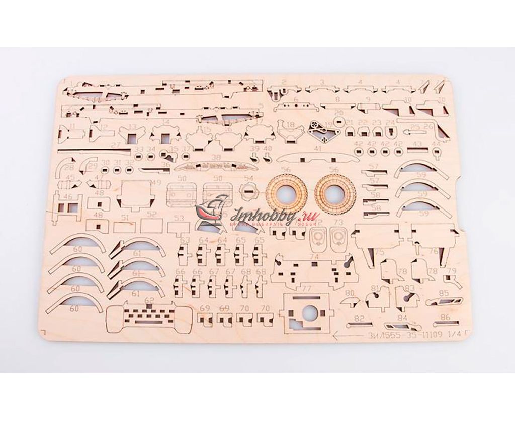 Сборная масштабная модель самосвала ММЗ-555 из фанеры. Детали изготовлены методом лазерной резки. Для сборки понадобятся столярный клей ПВА, модельный нож, надфиль (или наждачная бумага/губка). При желании модель можно окрасить или покрыть морилкой/лаком.