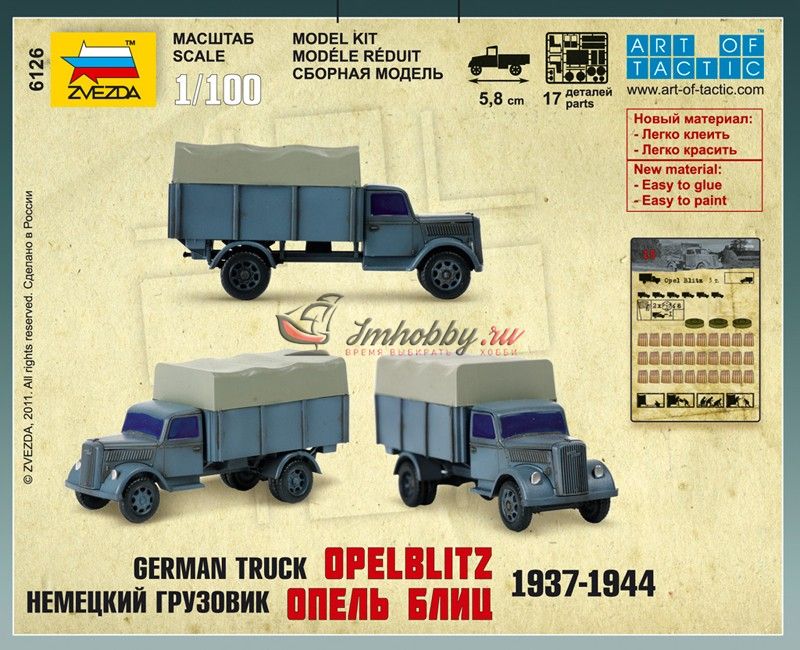 Сборная модель немецкого грузовика Опель Блиц 1937-1944г (Opel Blitz) в масштабе 1:100. «Опель-Блиц» лучший грузовой автомобиль вермахта. Выпускался с предвоенных лет и почти до поражения Германии во Второй Мировой Войне. Опель-Блиц применялся не только для перевозки солдат и грузов, но и как транспортировщик артиллерийских орудий. Модель автомобиля была настолько успешной, что его значок в виде молнии стал официальным знаком фирмы Опель.