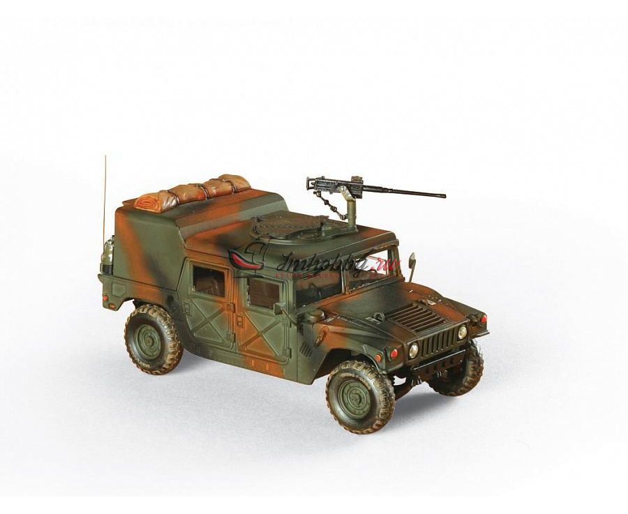 Сборная модель американского военного автомобиля Хаммер (Hummer) в масштабе 1:35. Наиболее интересный вариант состоящего на вооружении армии США бронированного автомобиля M998 HMMWV "Хаммер", рассчитанного на 8 человек. Он используется для выполнения специальных миссий в ходе антитеррористических операций, а также может забрасываться транспортными самолётами за линию фронта для действий в тылу противника. Автомобиль оснащён крупнокалиберным пулемётом M2 "Браунинг", но может нести и другое вооружение.