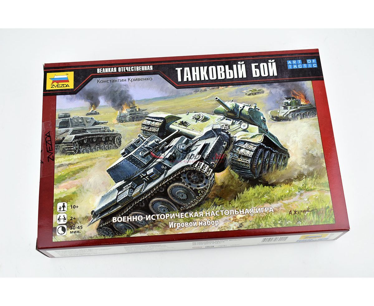 Игровой набор, Великая Отечественная, Танковый бой. В настольной игре «Танковый бой» игроки смогут разыграть захватывающие танковые сражения времен Великой Отечественной войны. Для начинающих игроков, которые только знакомятся с игровой системой Art of Tactic, этот набор будет отличным началом, благодаря небольшому количеству отрядов, для управления которыми не требуется сложных правил и специальных приказов. Для опытных игроков, которые уже знакомы с игровой системой Art of Tactic, данный набор станет достойным укреплением армии, потому что именно в этом наборе впервые появляются уникальные отряды ветеранов, не имеющие себе равных по типу. Так же игроки смогут расширить свое поле боя с помощью новых дополнительных игровых полей, которые теперь имеют еще больше вариантов сборки.