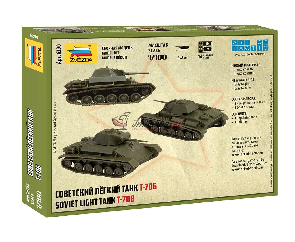 Сборная модель Советский лёгкий танк Т-70Б (T-70B) в масштабе 1:100. Т-70Б – модернизированный вариант Т-70, разрабатывался с июля 1942 г., его выпуск начался с октября того же года, на заводе ГАЗ в г. Горьком и на заводе №38 в г. Кирове. От ранних танков Т-70 модификация «Б» отличалась новой усиленной ходовой частью, изменённым выводом выхлопной системы, новым люком механика-водителя.