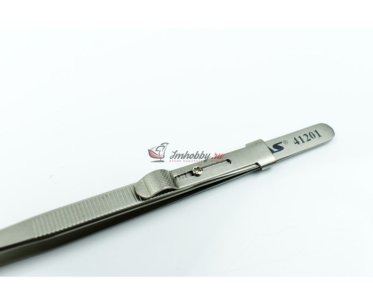 Изогнутый острый пинцет со скользящим зажимом в средней части. Губки пинцета не магнитятся и имеют насечку. С помощью зажима можно регулировать расстояние между кончиками пинцета и легко зафиксировать мелкую деталь в пинцете.