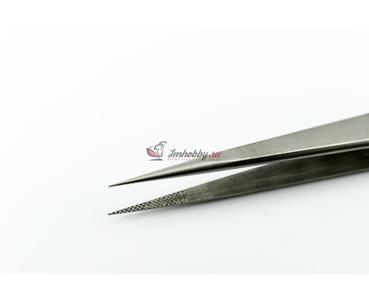 Прямой острый пинцет со скользящим зажимом в средней части. Губки пинцета не магнитятся и имеют насечку. С помощью зажима можно регулировать расстояние между кончиками пинцета и легко зафиксировать мелкую деталь в пинцете.
