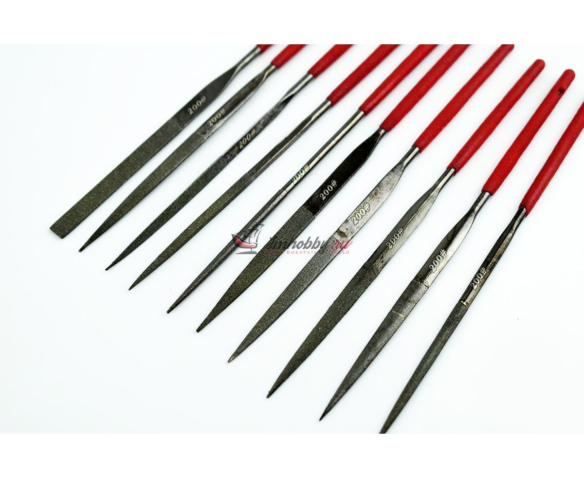 Набор из десяти алмазных надфилей №200 разных видов. В комплекте плоский, овальный, треугольный, круглый, квадратный надфили и т.д.. Полная длина 140 мм, рабочая поверхность около 50 мм. Надфили упакованы в прочный пластиковый чехол.