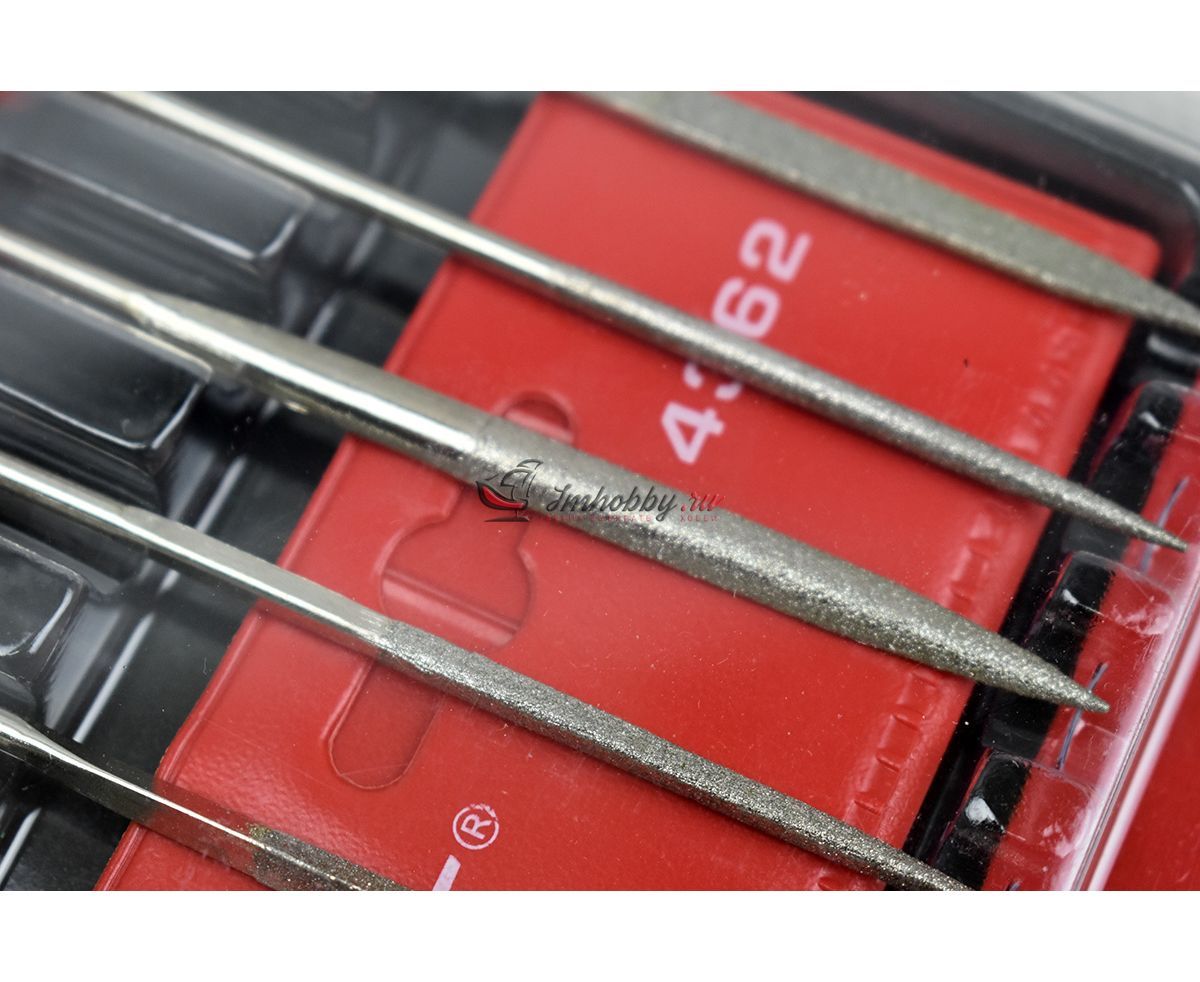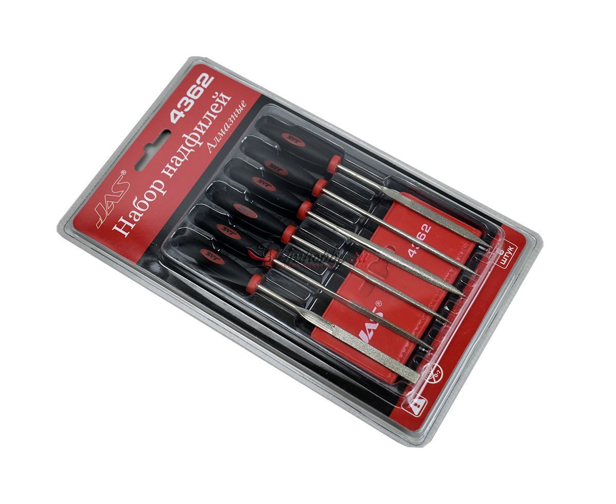 Набор из шести алмазных надфилей разной формы JAS4362. В комплекте плоский, треугольный, круглый, квадратный надфили и т.д.. Полная длина 140 мм, рабочая поверхность около 50 мм. Надфили упакованы в прочный пластиковый чехол.