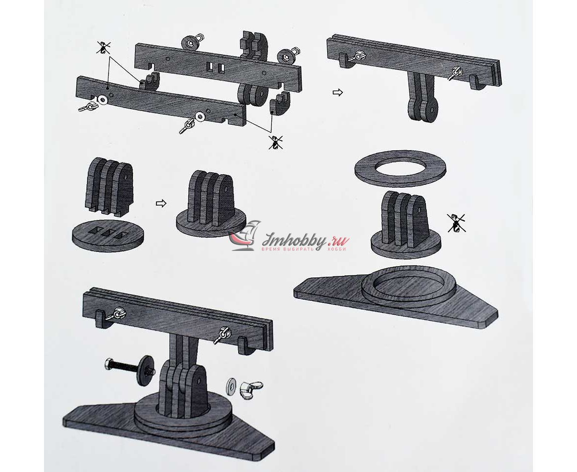 Держатель киля C5054 выполнен поворотным и может наклоняться. Для того, чтобы его губки не повредили киль модели, на них приклеиваются специальные бархатные накладки. Держатель поставляется в разобранном виде и требует предварительной сборки и склейки. Длина губок около 15 см. Подходит для моделей длиной 30-50 см.